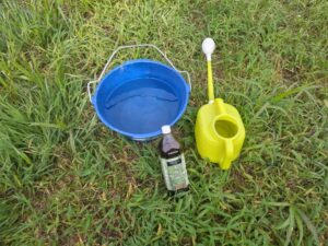 ジョウロに木酢液をキャップ4杯入れ、撒いてやった。