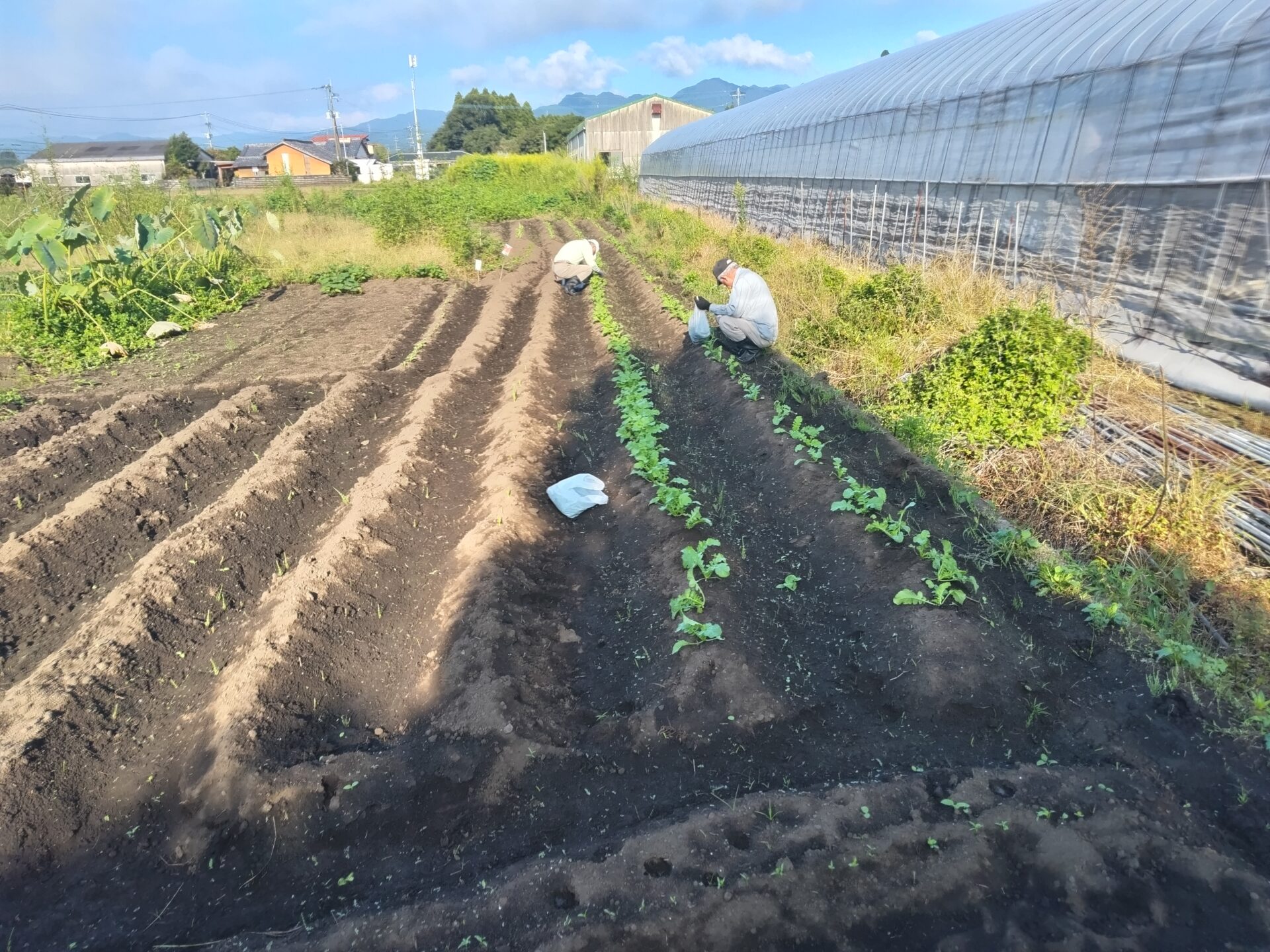 植えてる量も少ないので、三人でやることにし、30分そこそこで終わった。