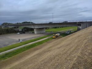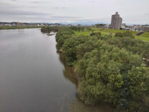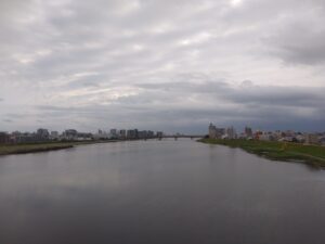 大淀川。河川浚渫工事の台船が遠くに見え、