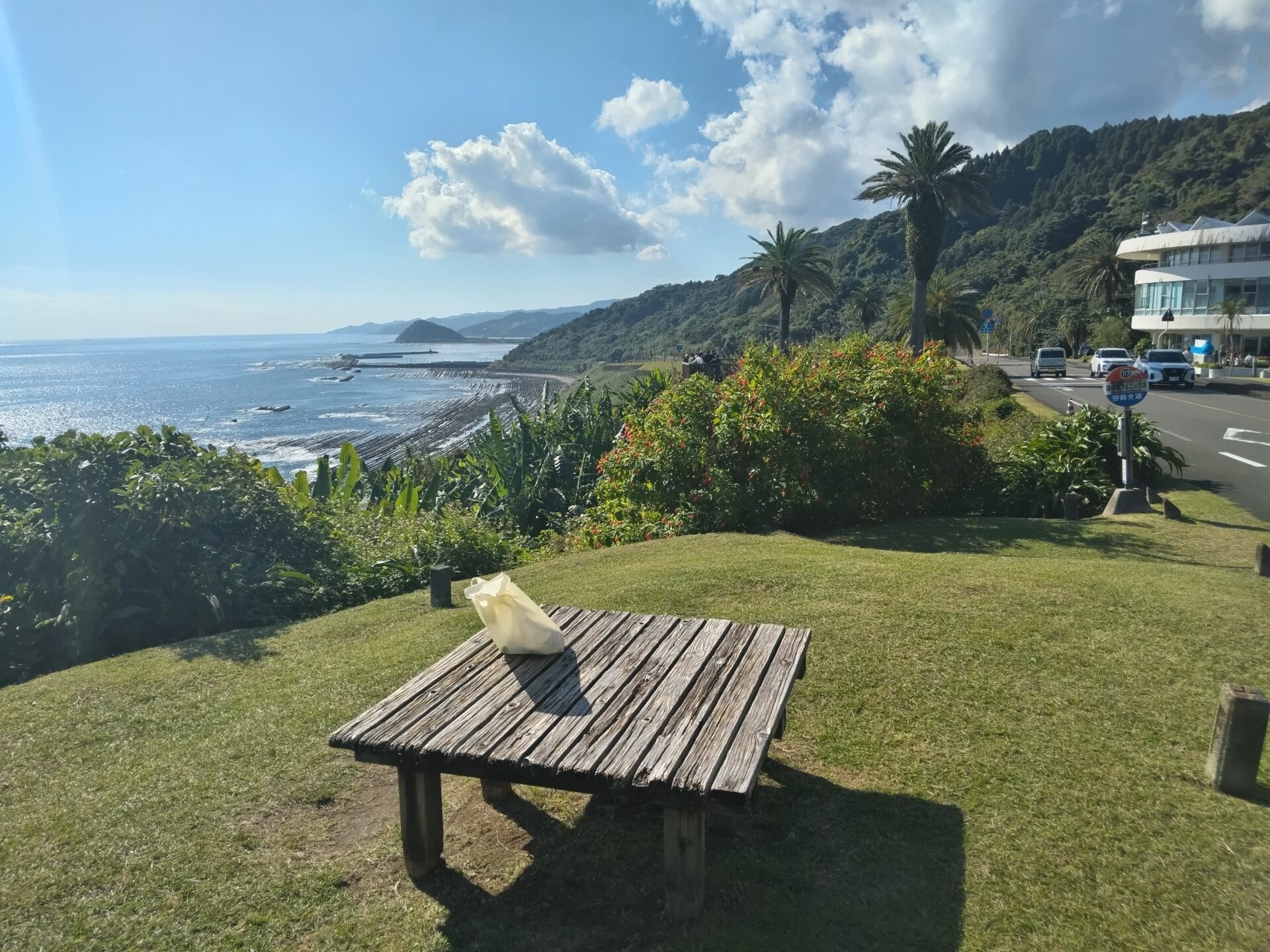 シクラメンを入れたカゴ二つ、木花まで返しに行き、Aコープで海鮮丼を買い。大好きな場所へ。