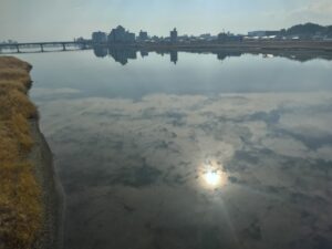川面に写る太陽と雲。キレイだった。
