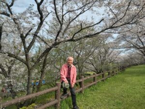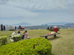 桜と桜島を眺めながら、”団子つきの昼ごはん”。