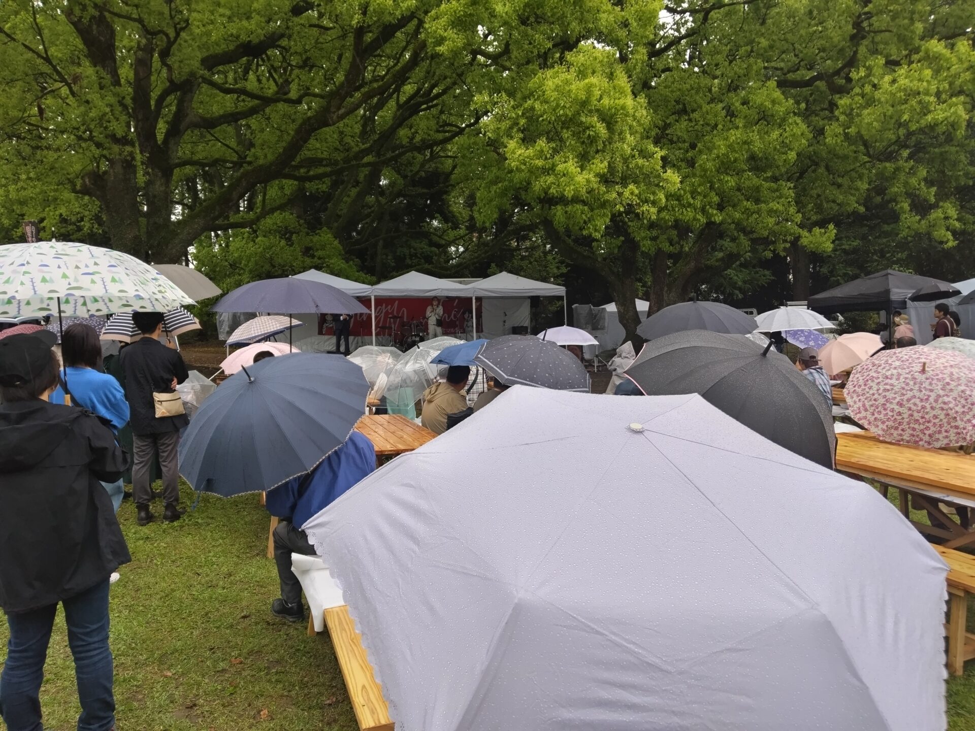 多くの聴衆(ほとんど中年の女性)。「二人の登場、知ってたのか?」は分からないが、傘をさし、聴き入っていた。