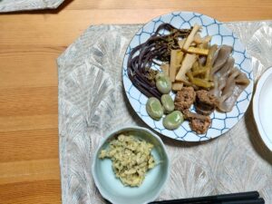 Yさんの手作り。山菜の煮物とタケノコの味噌和え(山椒入り)。一流料亭も顔負け!山椒、ソラマメは自宅の庭の物だそうだ。